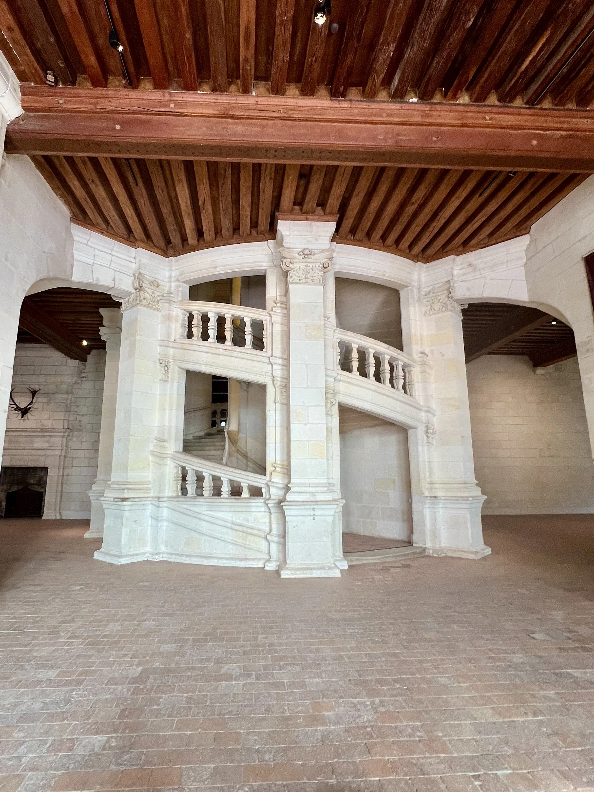 Double helix center staircase designed by Leonardo de Vinci. Enter from either side but you shall never meet!